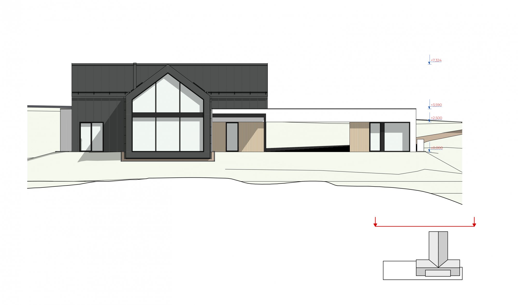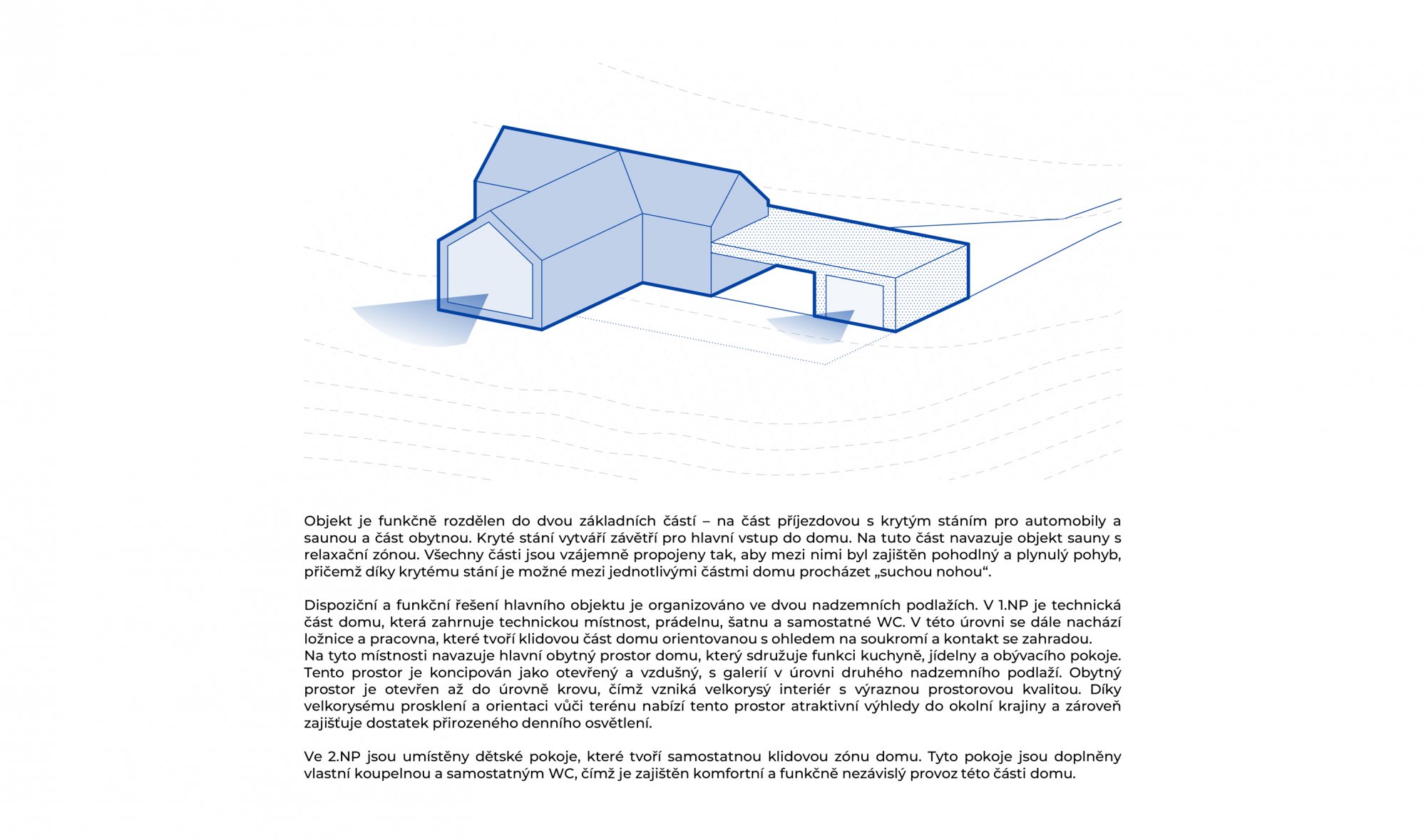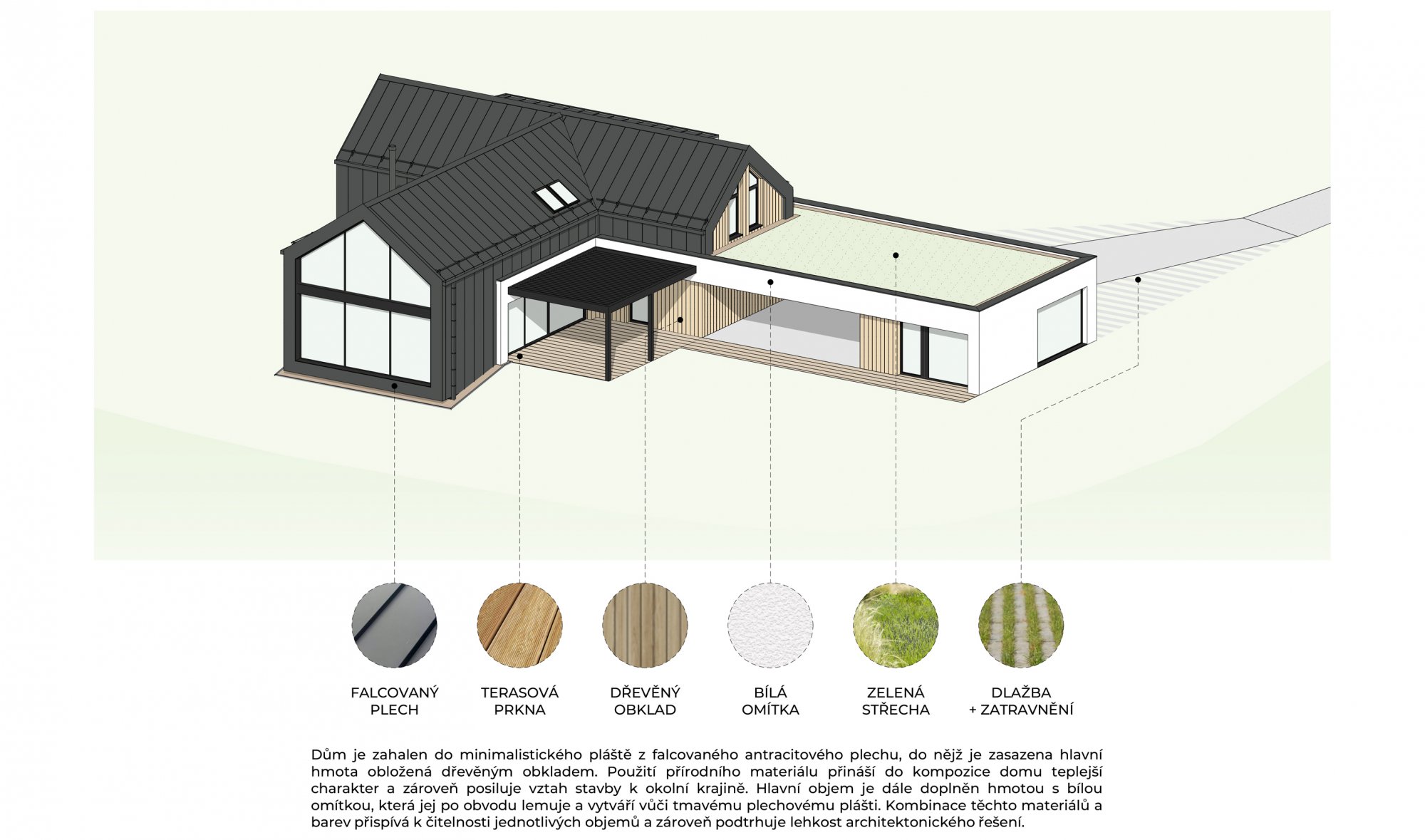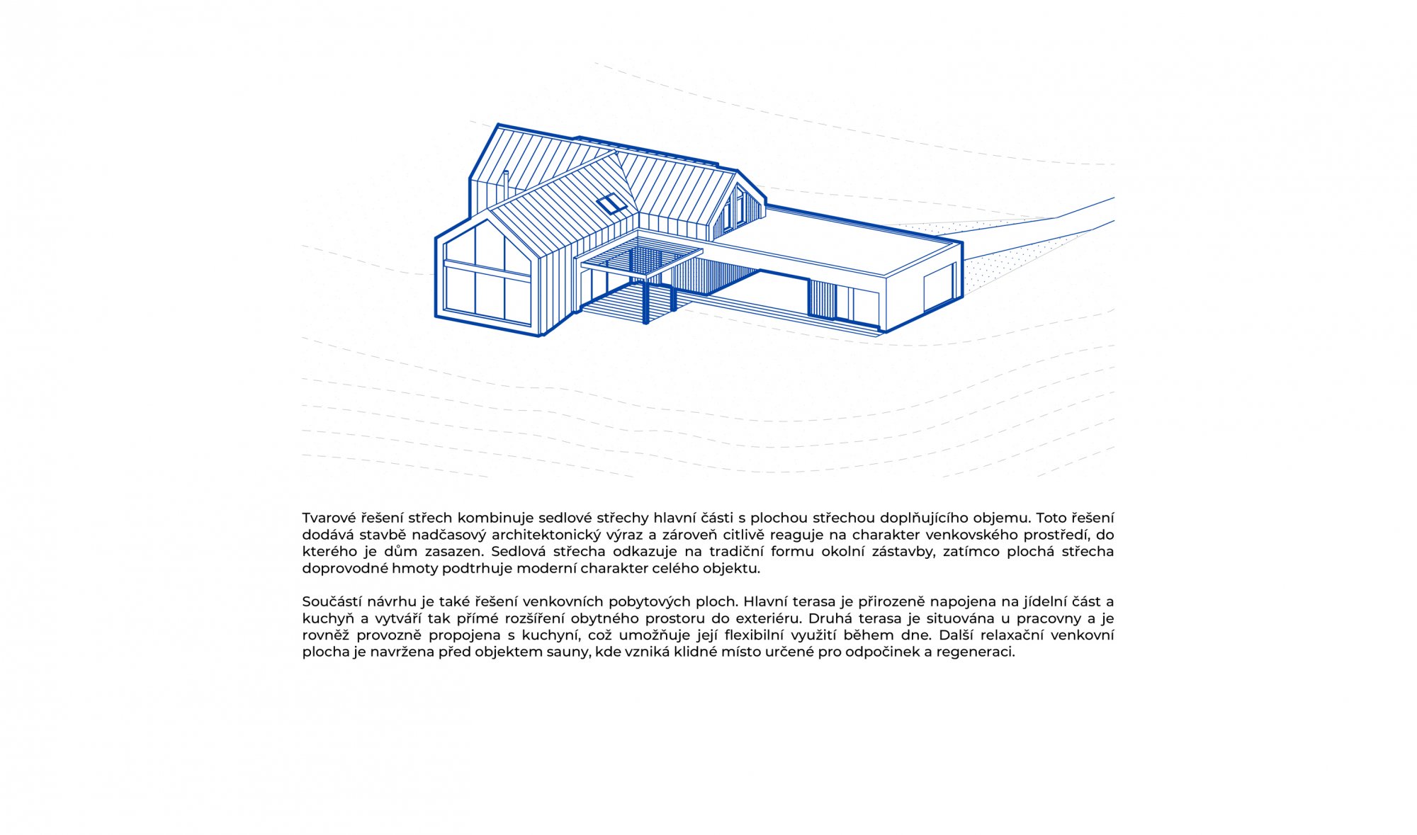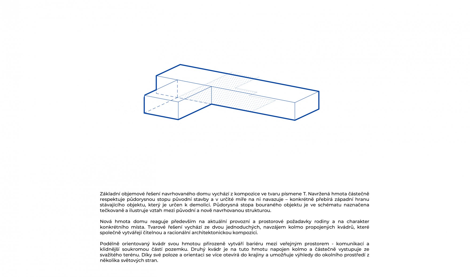 Jedná se o dvoupodlažní rodinným dům s obytným podkrovím o zastavěné ploše 305,8 m2. Základní objemové řešení navrhovaného domu vychází z kompozice ve tvaru písmene T. Navržená hmota částečně respektuje půdorysnou stopu původní stavby a v určité míře na ni navazuje - konkrétně přebírá západní hranu stávajícího objektu, který je určen k demolici. Tvarové řešení střech kombinuje sedlové střechy hlavní části s plochou střechou doplňujícího objemu. Toto řešení dodává stavbě nadčasový architektonický výraz a zároveň citlivě reaguje na charakter venkovského prostředí, do kterého je dům zasazen. Sedlová střecha odkazuje na tradiční formu okolní zástavby, zatímco plochá střecha doprovodné hmoty podtrhuje moderní