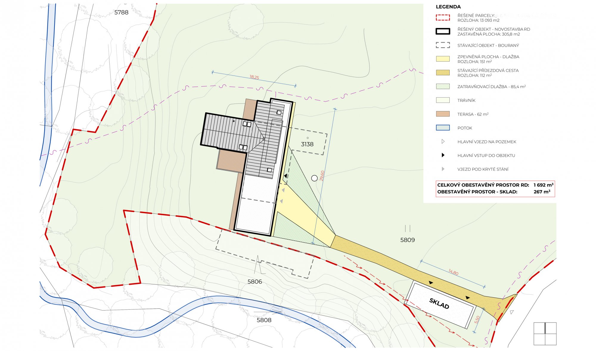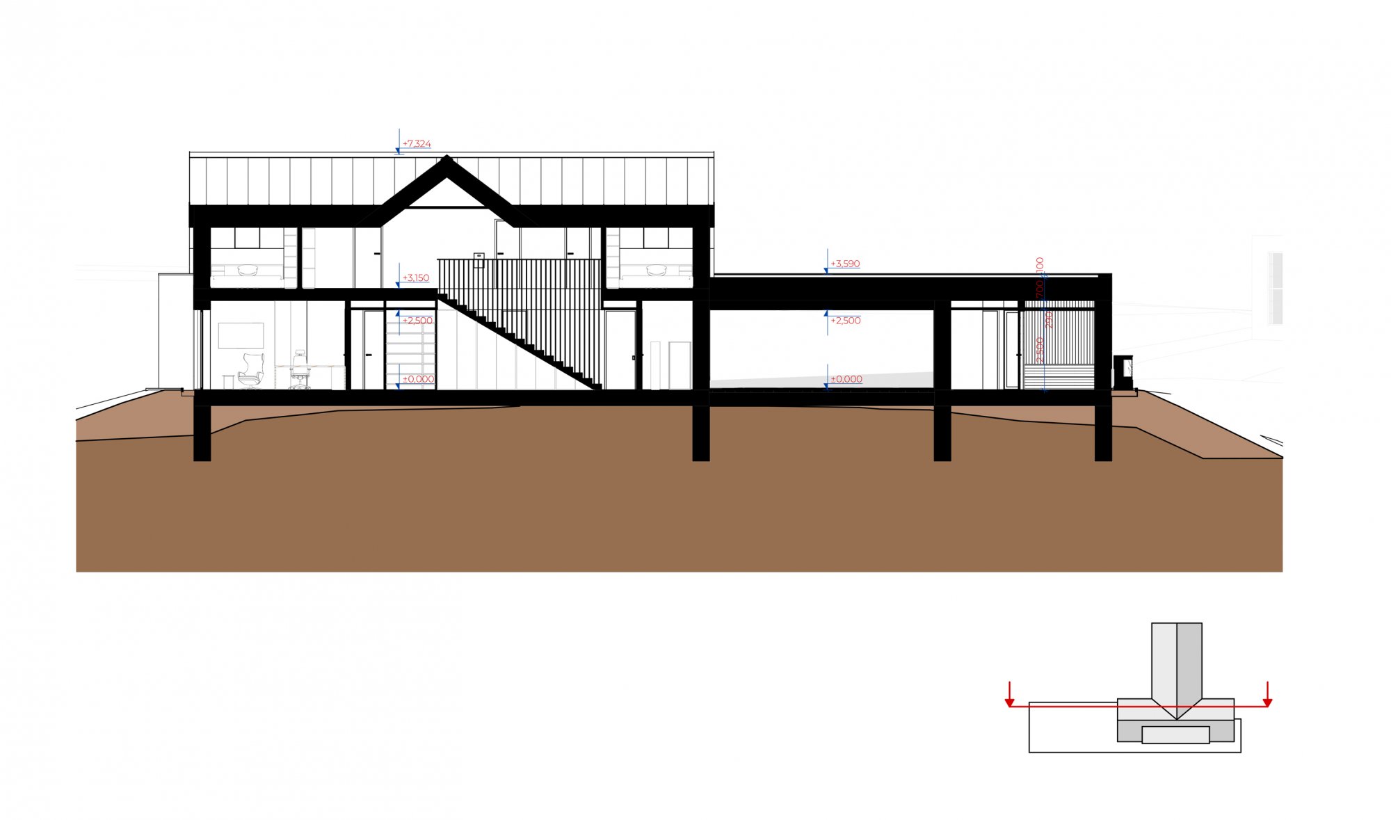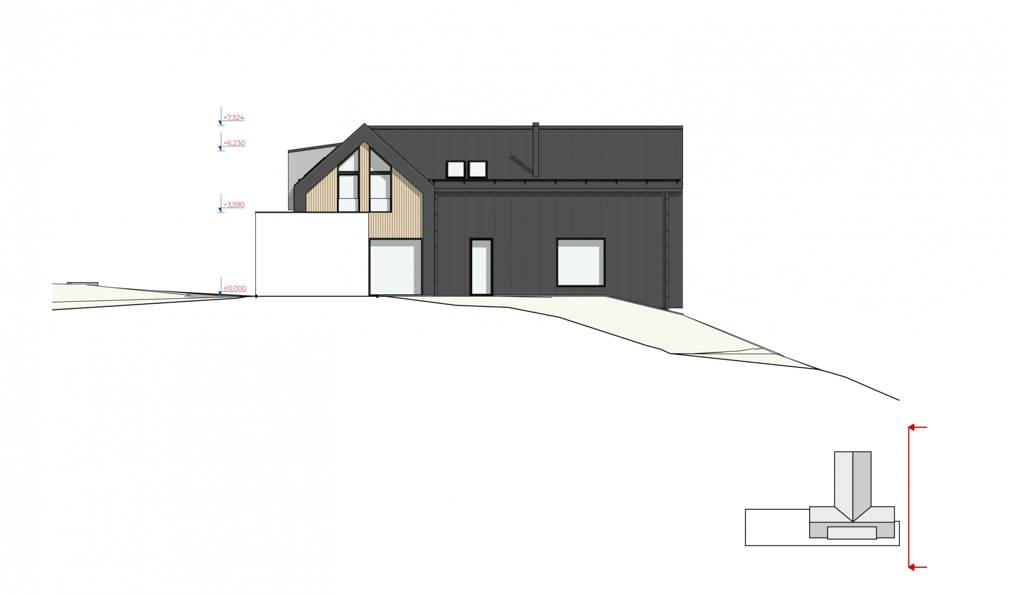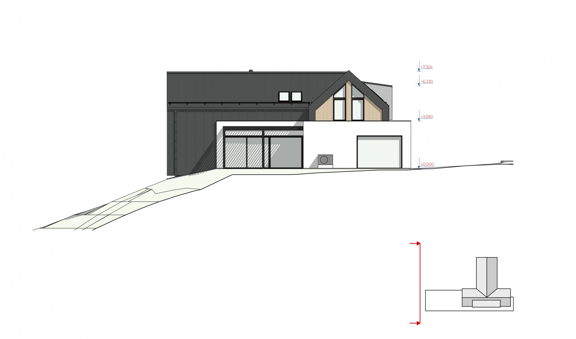 Jedná se o dvoupodlažní rodinným dům s obytným podkrovím o zastavěné ploše 305,8 m2. Základní objemové řešení navrhovaného domu vychází z kompozice ve tvaru písmene T. Navržená hmota částečně respektuje půdorysnou stopu původní stavby a v určité míře na ni navazuje - konkrétně přebírá západní hranu stávajícího objektu, který je určen k demolici. Tvarové řešení střech kombinuje sedlové střechy hlavní části s plochou střechou doplňujícího objemu. Toto řešení dodává stavbě nadčasový architektonický výraz a zároveň citlivě reaguje na charakter venkovského prostředí, do kterého je dům zasazen. Sedlová střecha odkazuje na tradiční formu okolní zástavby, zatímco plochá střecha doprovodné hmoty podtrhuje moderní