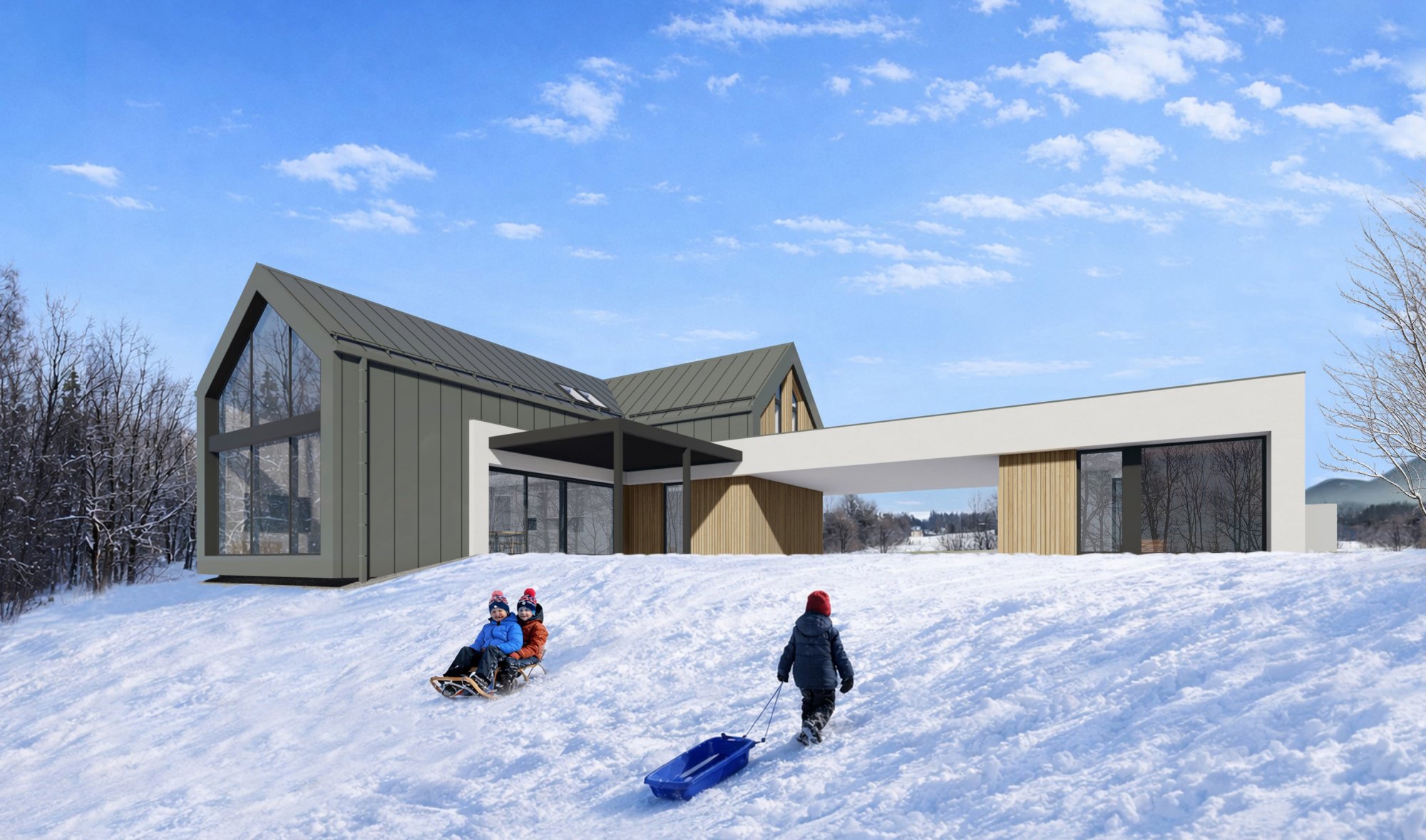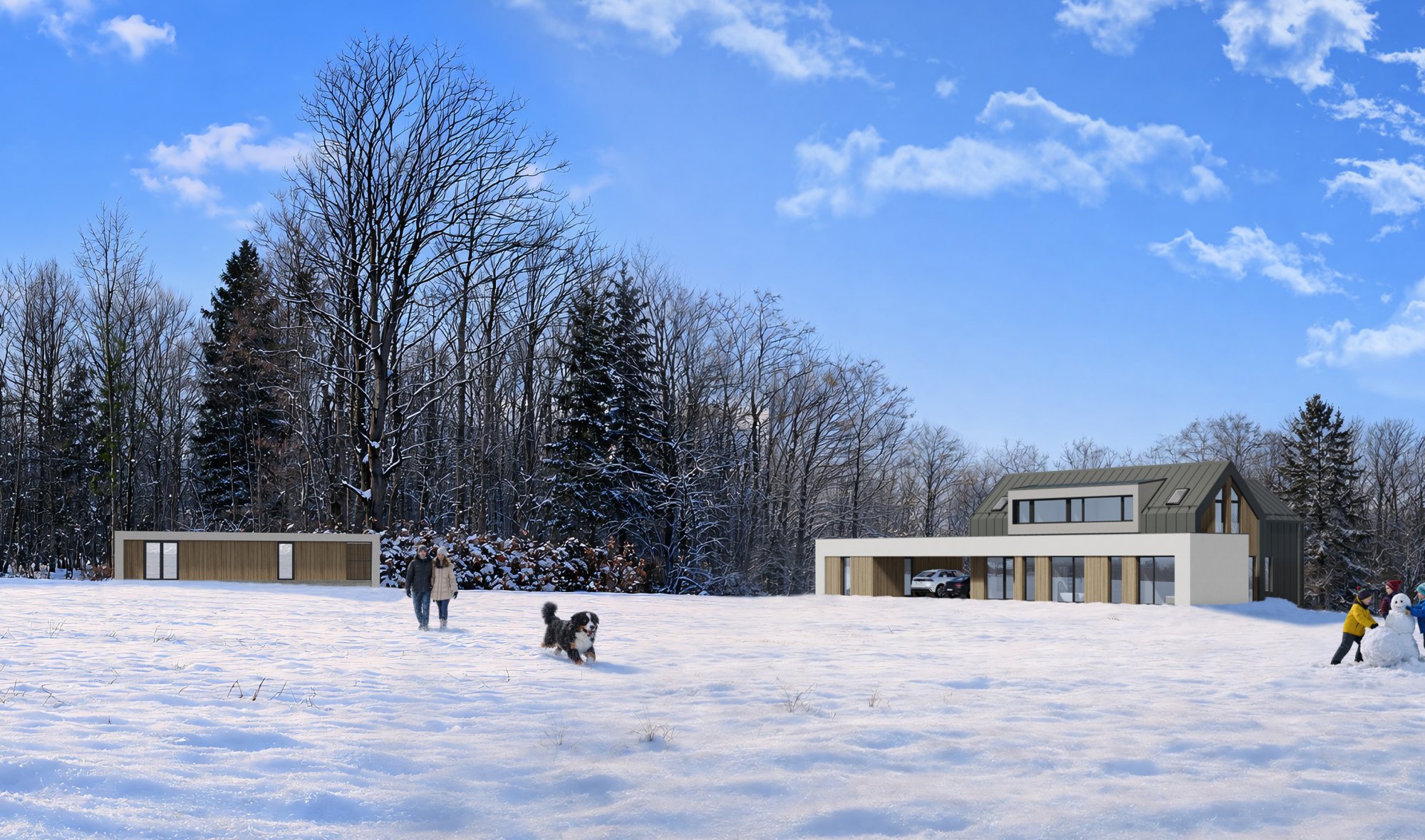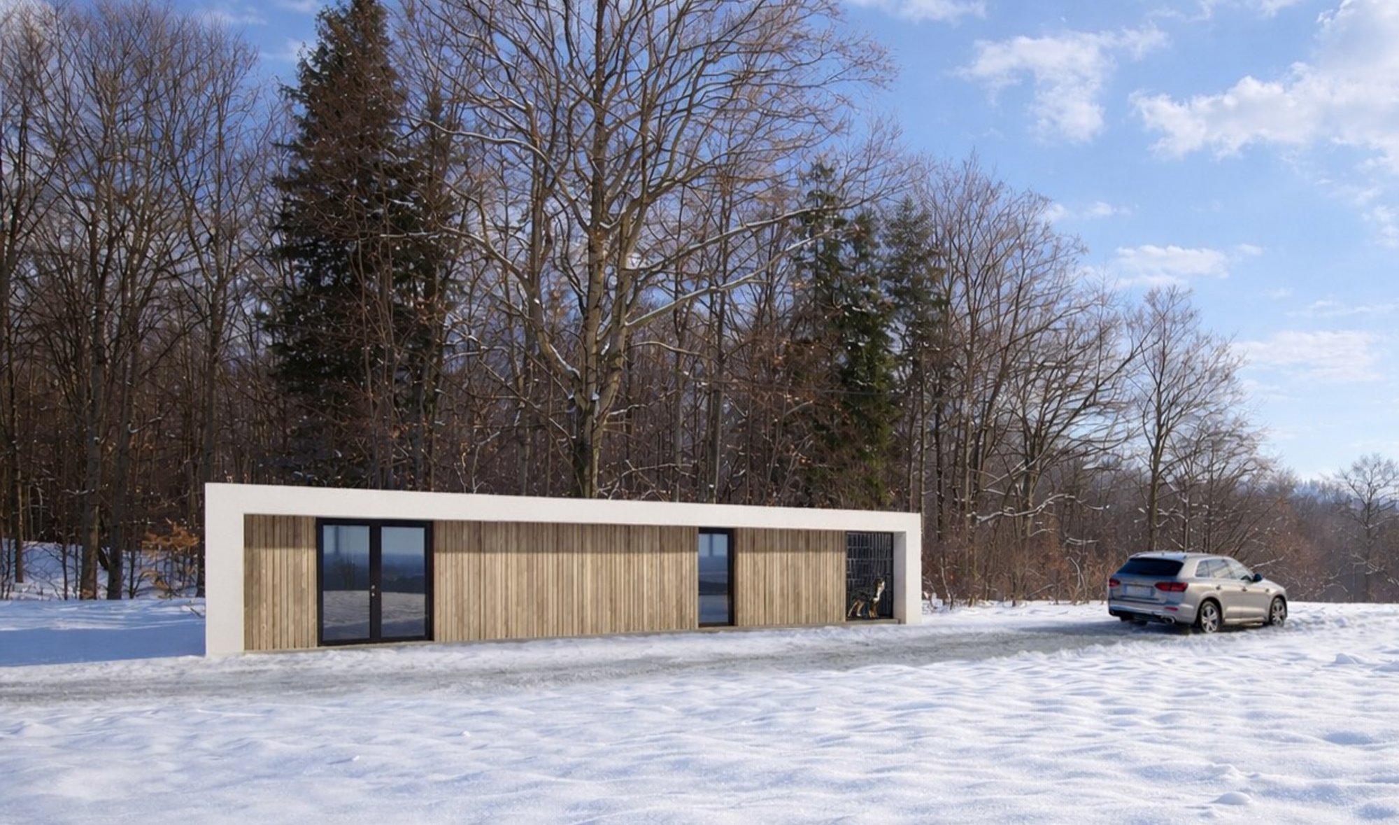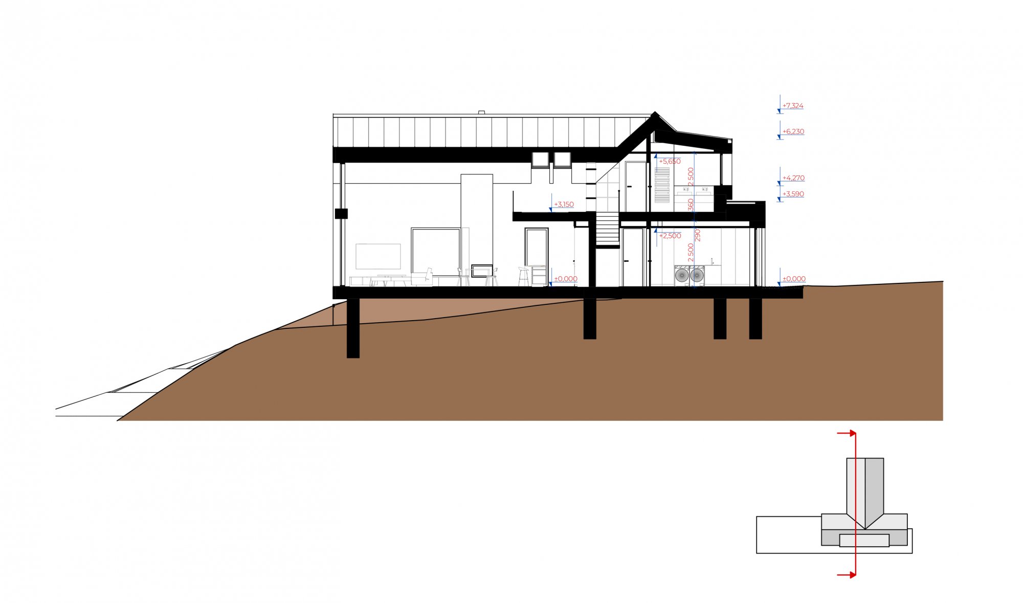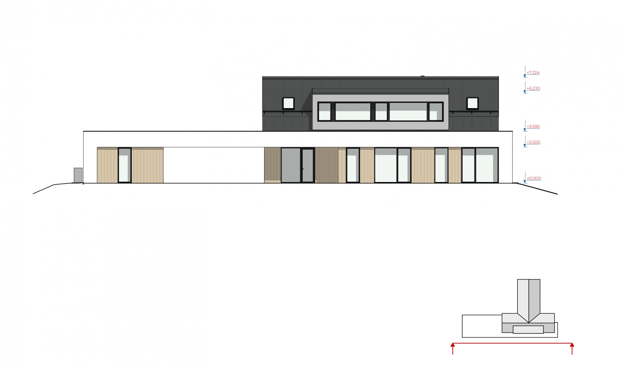 Jedná se o dvoupodlažní rodinným dům s obytným podkrovím o zastavěné ploše 305,8 m2. Základní objemové řešení navrhovaného domu vychází z kompozice ve tvaru písmene T. Navržená hmota částečně respektuje půdorysnou stopu původní stavby a v určité míře na ni navazuje - konkrétně přebírá západní hranu stávajícího objektu, který je určen k demolici. Tvarové řešení střech kombinuje sedlové střechy hlavní části s plochou střechou doplňujícího objemu. Toto řešení dodává stavbě nadčasový architektonický výraz a zároveň citlivě reaguje na charakter venkovského prostředí, do kterého je dům zasazen. Sedlová střecha odkazuje na tradiční formu okolní zástavby, zatímco plochá střecha doprovodné hmoty podtrhuje moderní