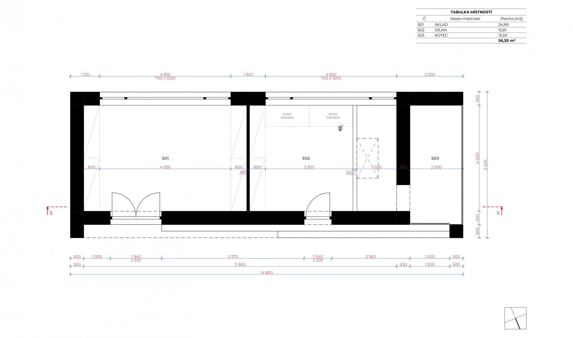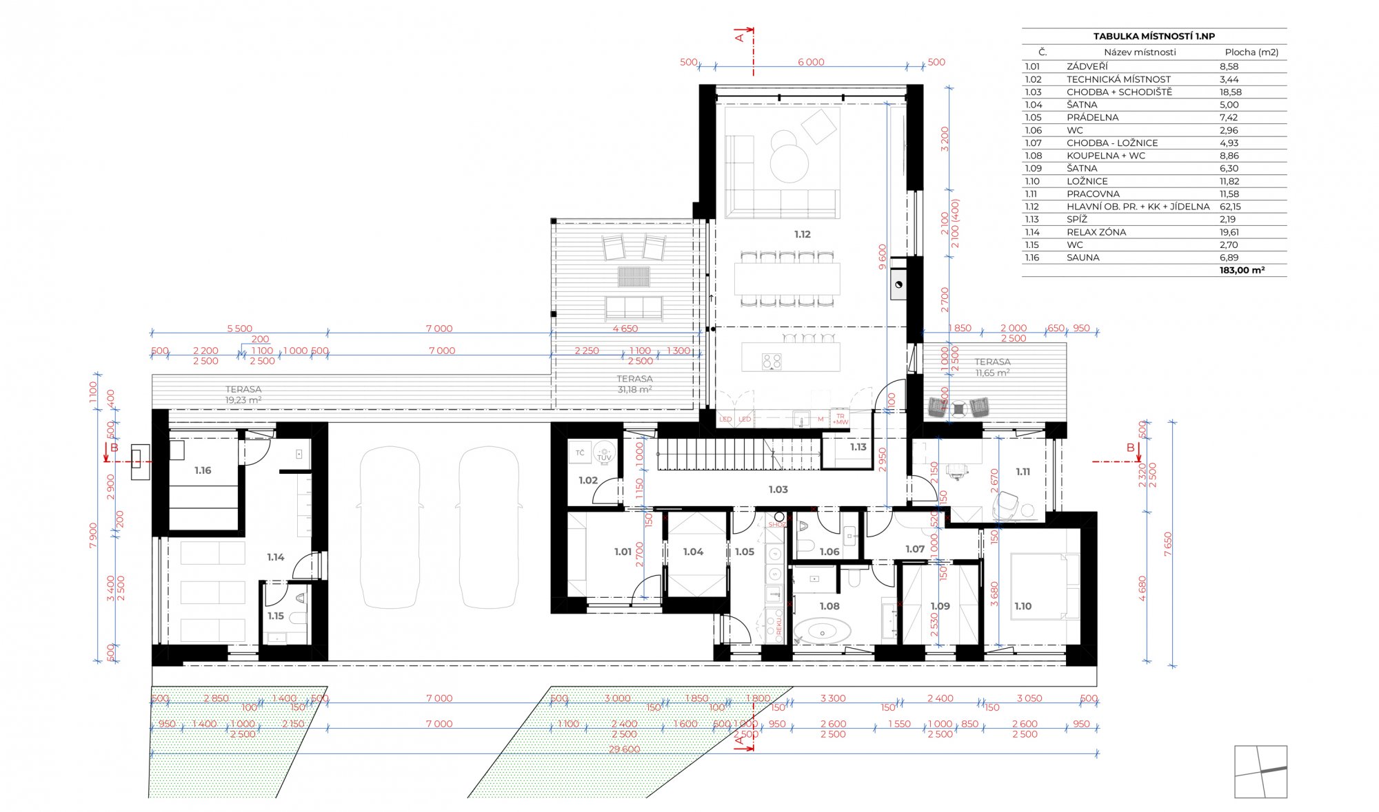 Dispoziční a funkční řešení hlavního objektu je organizováno ve dvou nadzemních podlažích. V 1.NP je technická část domu, která zahrnuje technickou místnost, prádelnu, šatnu a samostatné WC. V této úrovni se dále nachází ložnice a pracovna, které tvoří klidovou část domu orientovanou s ohledem na soukromí a kontakt se zahradou. Na tyto místnosti navazuje hlavní obytný prostor domu, který sdružuje funkci kuchyně, jídelny a obývacího pokoje. Tento prostor je koncipován jako otevřený a vzdušný, s galerií v úrovni druhého nadzemního podlaží. Obytný prostor je otevřen až do úrovně krovu, čímž vzniká velkorysý interiér s výraznou prostorovou kvalitou. Díky velkorysému prosklení a orientaci vůči terénu nabízí tento prostor atraktivní