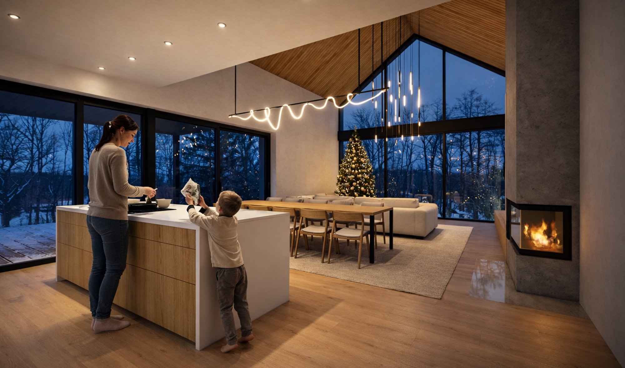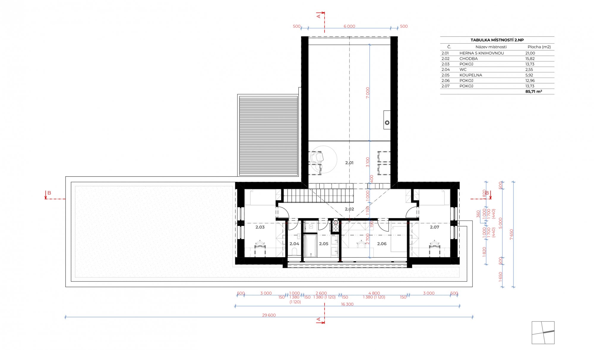 Ve 2.NP jsou umístěny dětské pokoje, které tvoří samostatnou klidovou zónu domu. Tyto pokoje jsou doplněny vlastní koupelnou a samostatným WC, čímž je zajištěn komfortní a funkčně nezávislý provoz této části domu. Součástí návrhu je také řešení venkovních pobytových ploch. Hlavní terasa je přirozeně napojena na jídelní část a kuchyň a vytváří tak přímé rozšíření obytného prostoru do exteriéru. Druhá terasa je situována u pracovny a je rovněž provozně propojena s kuchyní, což umožňuje její flexibilní využití během dne. Další relaxační venkovní plocha je navržena před objektem sauny, kde vzniká klidné místo určené pro