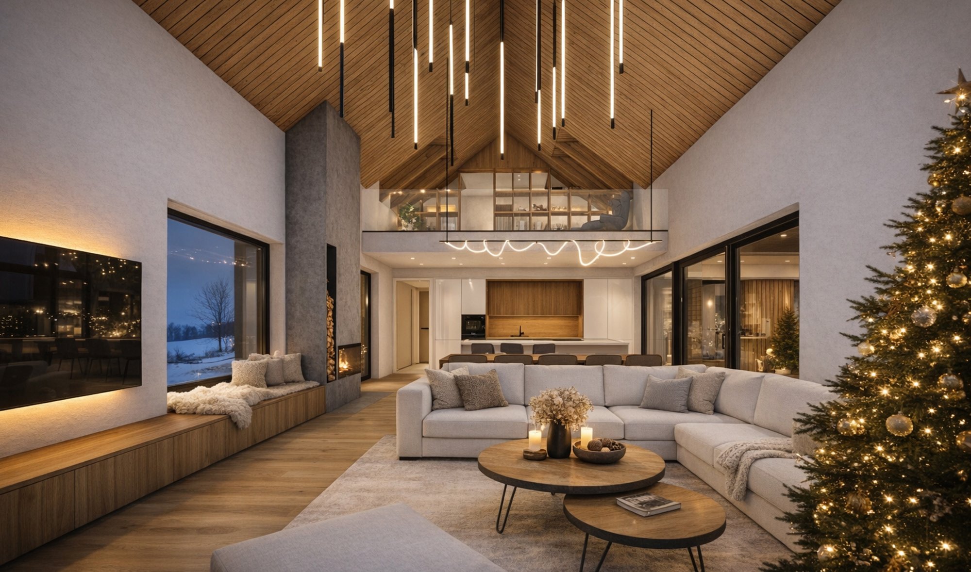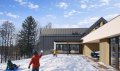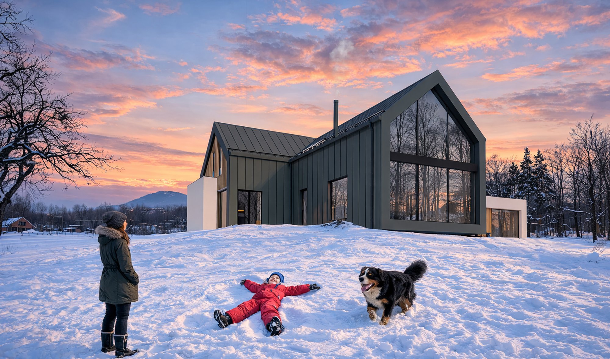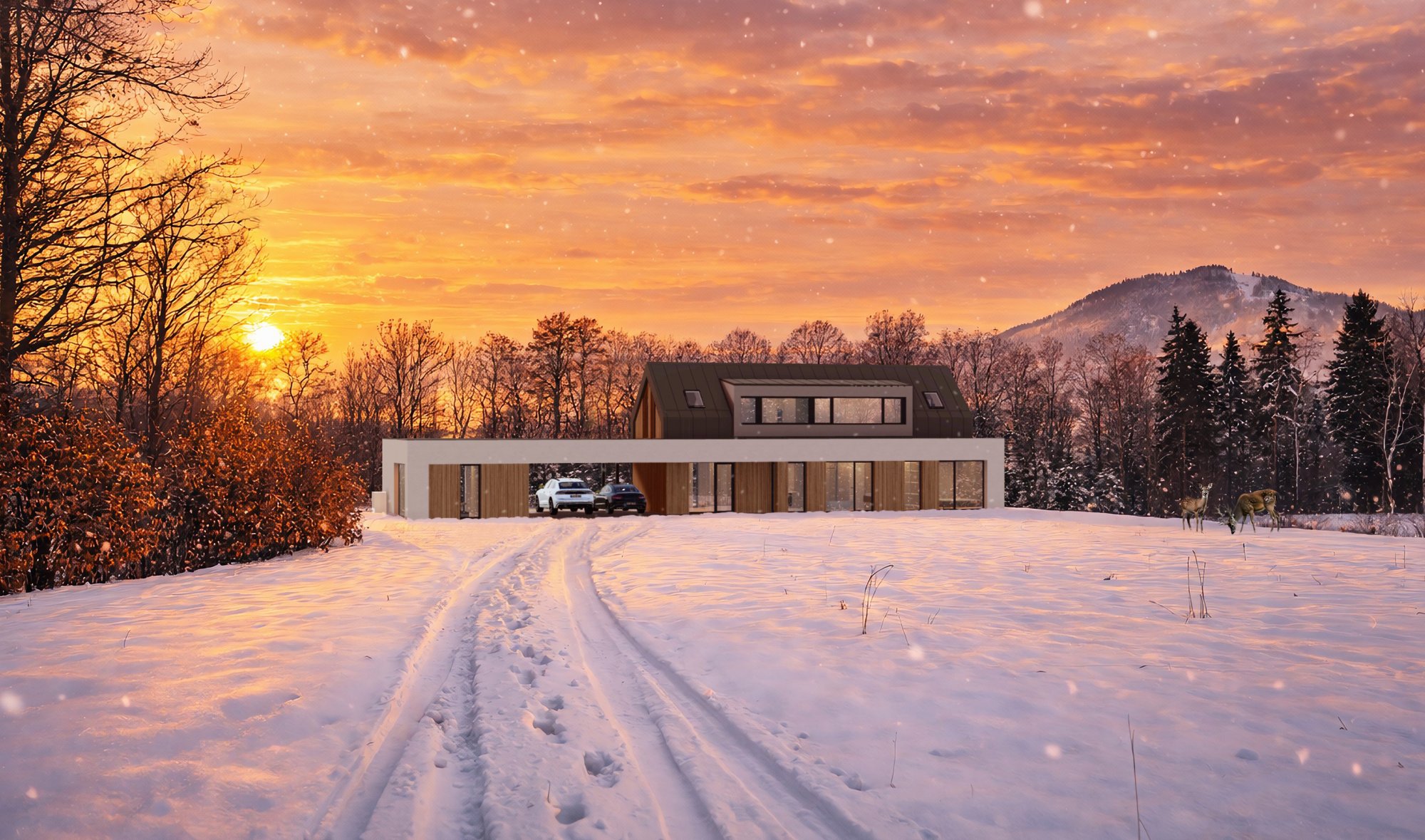 Dům je z velké části zahalen do falcovaného plechu s antracitovým odstínem - z plechu je nejen střešní krytina, ale jsou jím obloženy i stěny hlavní hmoty vystupující z terénu směrem k strmému svahu a lesu.Hmota podélného kvádru je v bílé omítce doplněna o obklad z dřevěných prken. Vikýř v 2.NP je pak zahalen do šedé omítky. Celkově se tak architektonický koncept domu pohybuje na pomezí tradičního vzhledu a moderního designu, což odráží snahu o respekt k přírodnímu okolí a současně nabízí vysoký standard bydlení.
